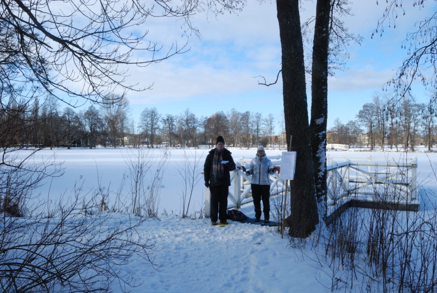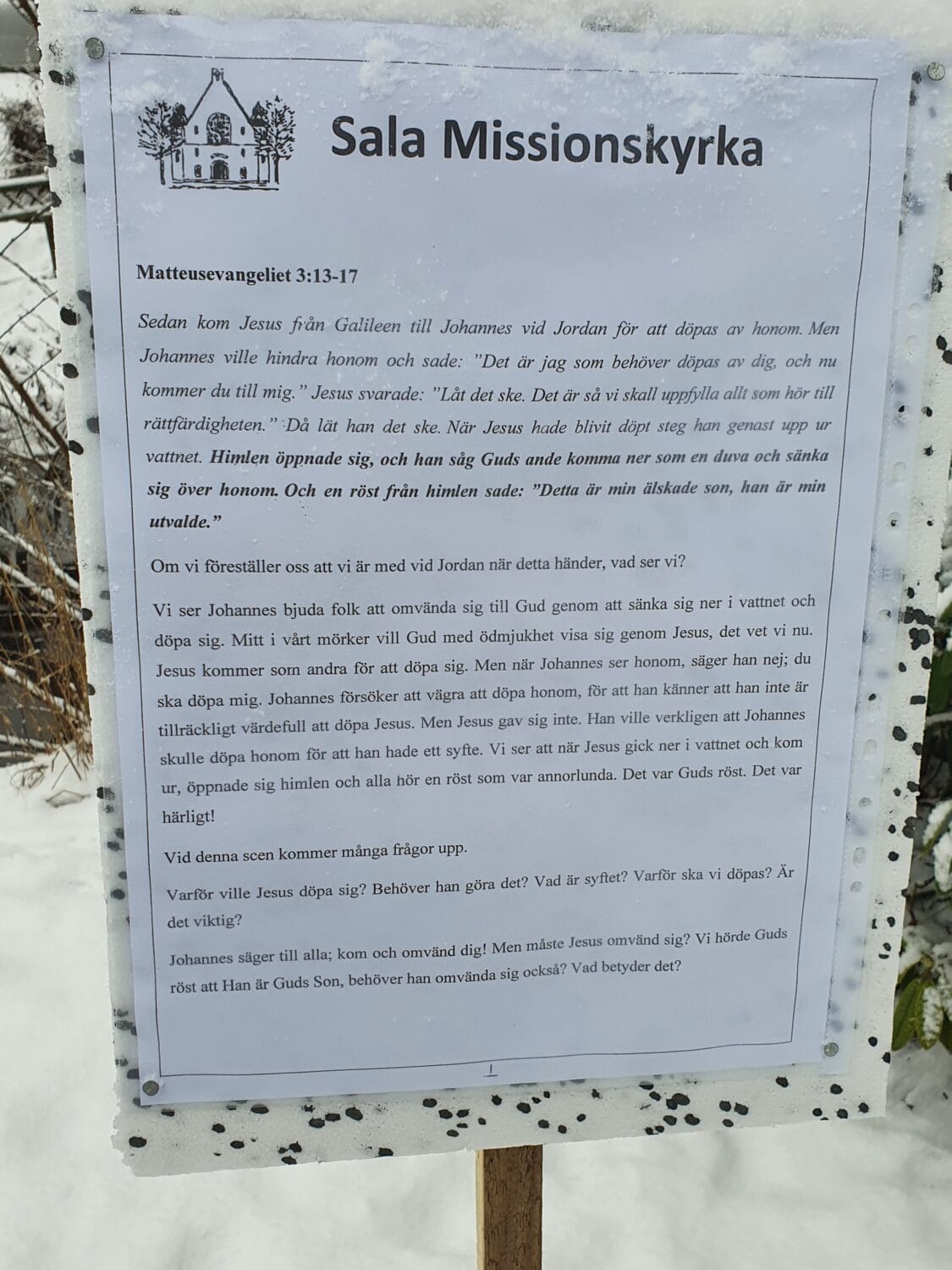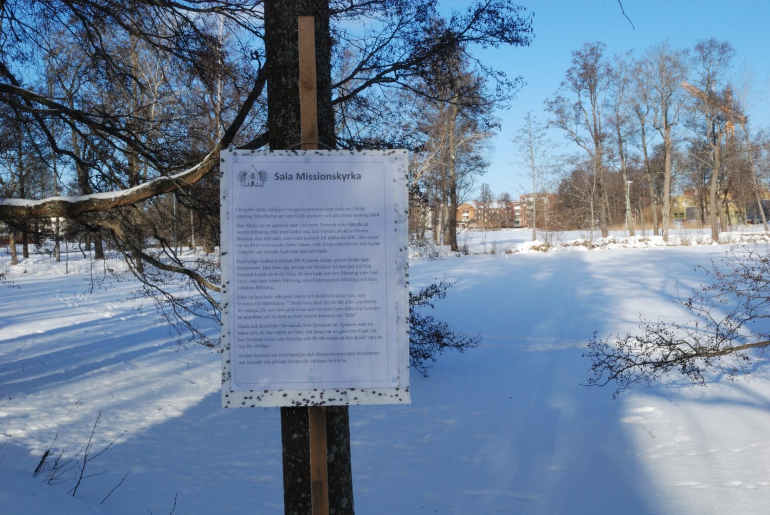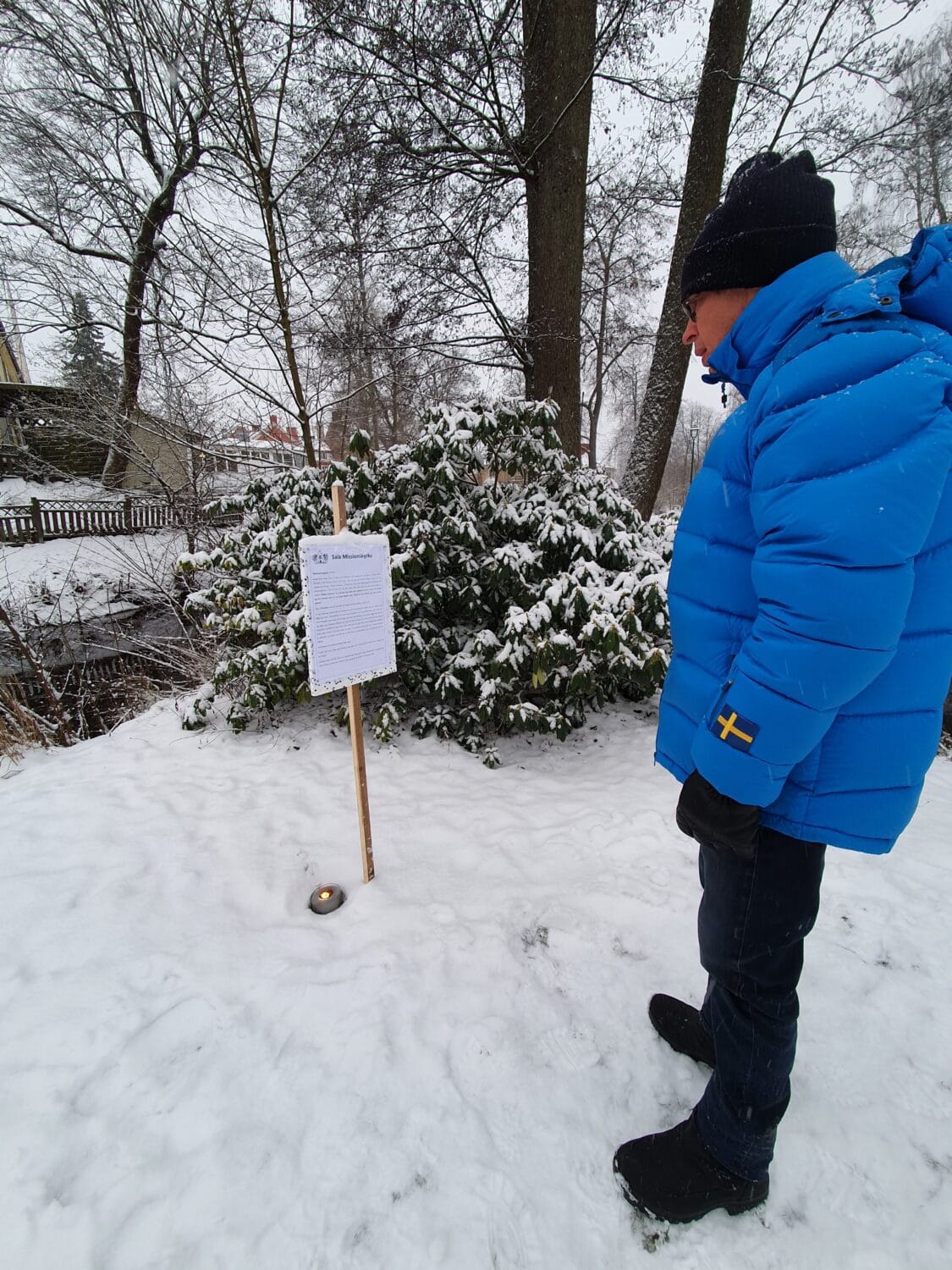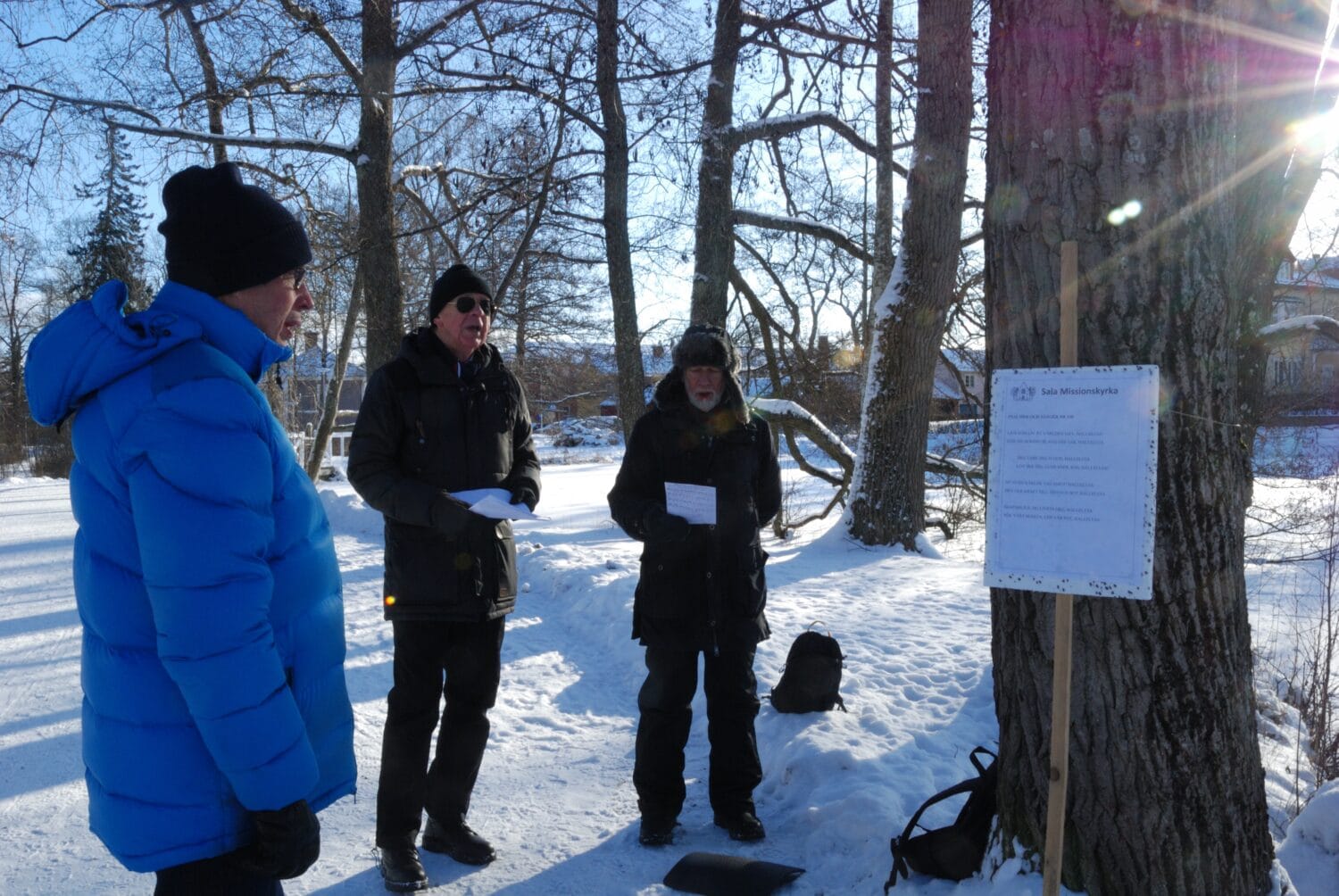 En kylig men strålande vintersöndag med vandring runt dammarna i centrala Sala. Vandringen startade vid Missionskyrkan. Åsa och Margareta stod vid bryggan och sjöng tillsammans med oss. Predikan kunde vi ta del av vid olika stationer. Även änderna var samlade. På sista stationen var Carl-Olov och Ingbert ”sångledare”. Vandringen avslutades i Missionskyrkan med ljuständning och Herrens Välsignelse.