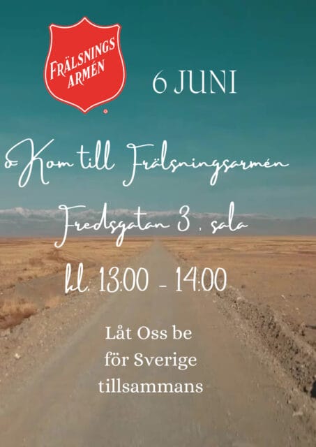 Detta evenemang har redan ägt rum. 6 juni, 2024 13:00 - 14:00 Bön för Sverige – Frälsningsarmén Sala Lägg till i kalender Google Kalender iCalendar Outlook 365 Outlook Live Dela